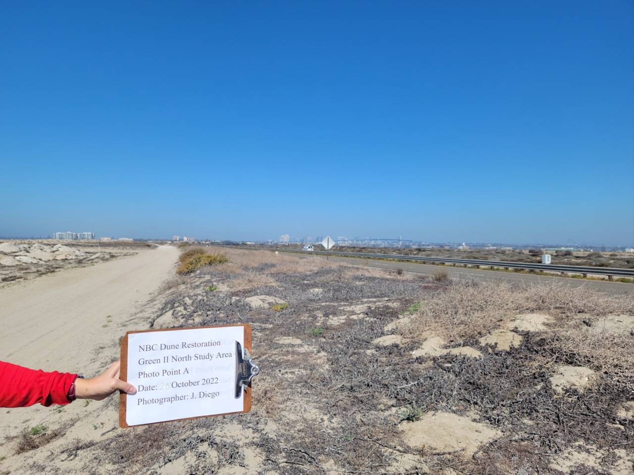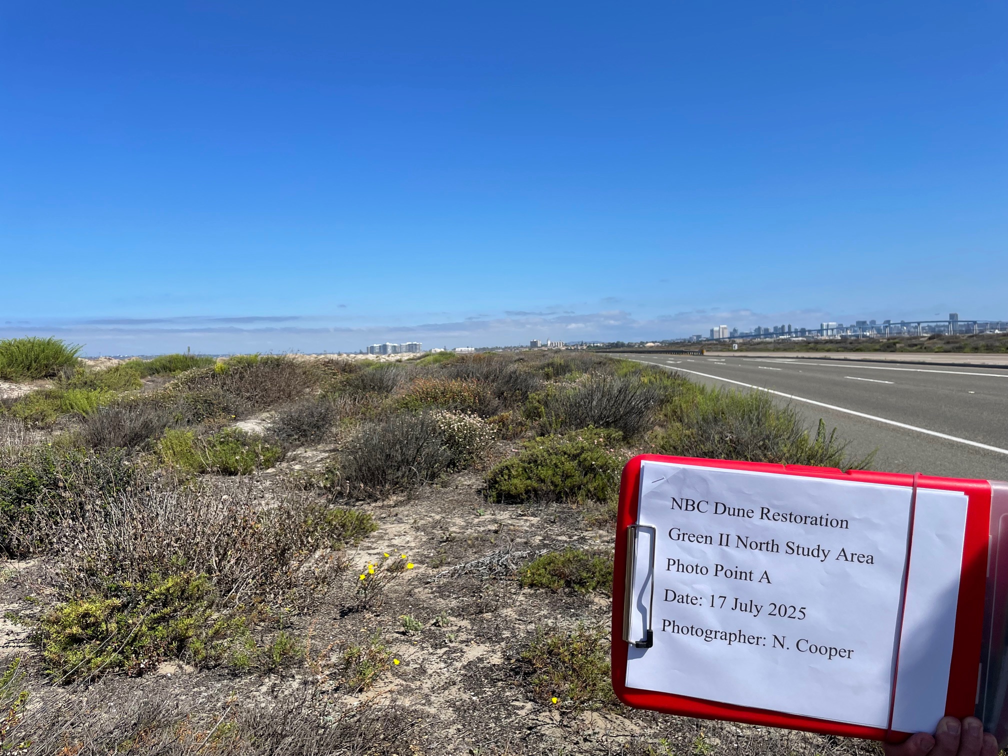 In September 2021, the Department of the Navy and the Soil Ecology and Restoration Group (SERG) of the San Diego State University Research Foundation (SDSURF) entered into an Agreement with the purpose of restoring 4,112 square meters of dune habitat located in NBC. To fulfill this objective, the following specific tasks were implemented: (1) treat and/or remove iceplant and other non-native species; (2) collect and propagate appropriate native plant material for outplanting; (3) outplant container stock; (4) maintain the restoration site; (5) monitor the site; (6) implement remedial measures, as necessary, to achieve success criteria; and (7) prepare reports that document project activities and results.